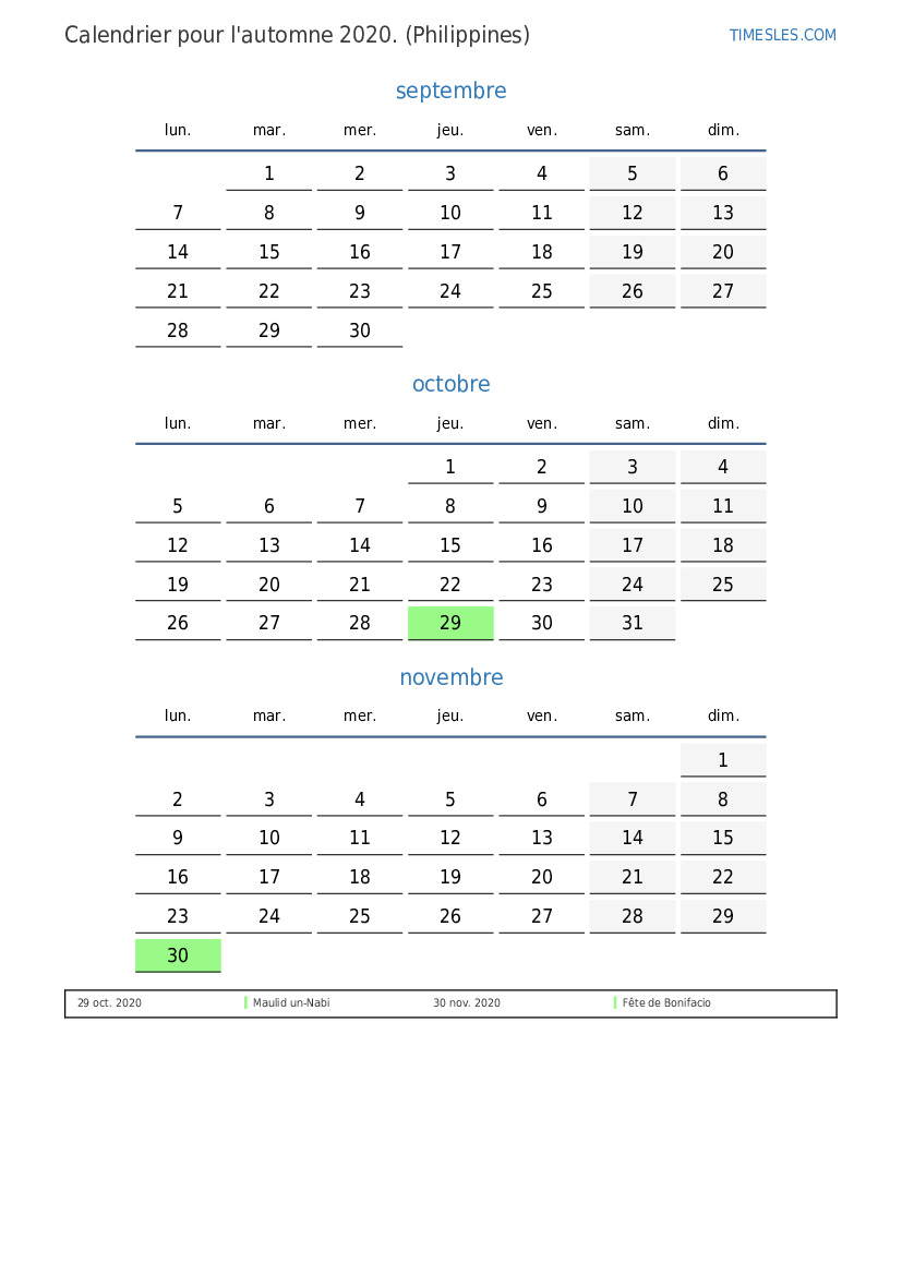 Téléchargez et imprimez le calendrier PDF avec les jours fériés et les week-ends pour l'automne 2020 pour les Philippines