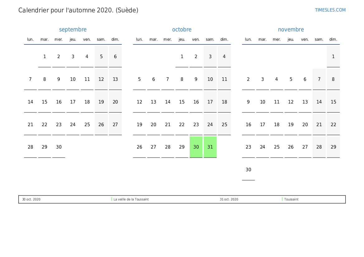 Téléchargez et imprimez le calendrier PDF avec les jours fériés et les week-ends pour l'automne 2020 pour la Suède