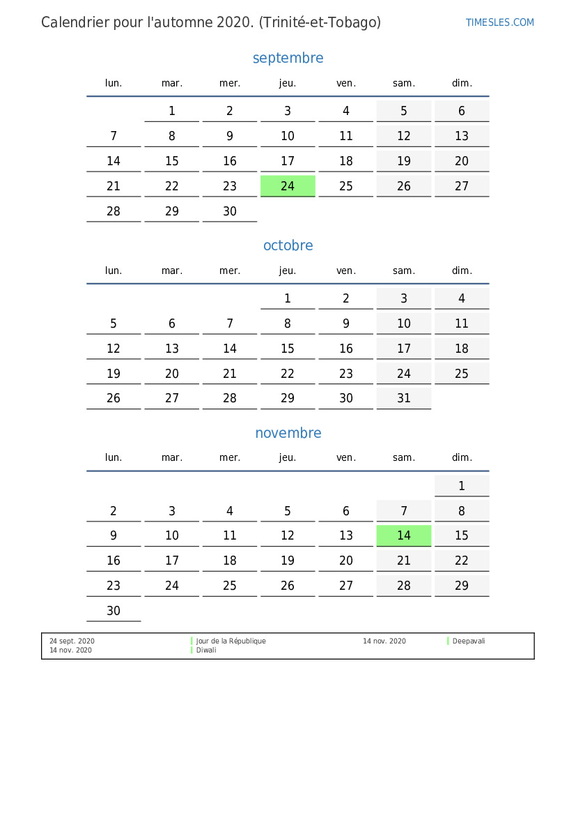 Téléchargez et imprimez le calendrier PDF avec les jours fériés et les week-ends pour l'automne 2020 pour Trinité-et-Tobago