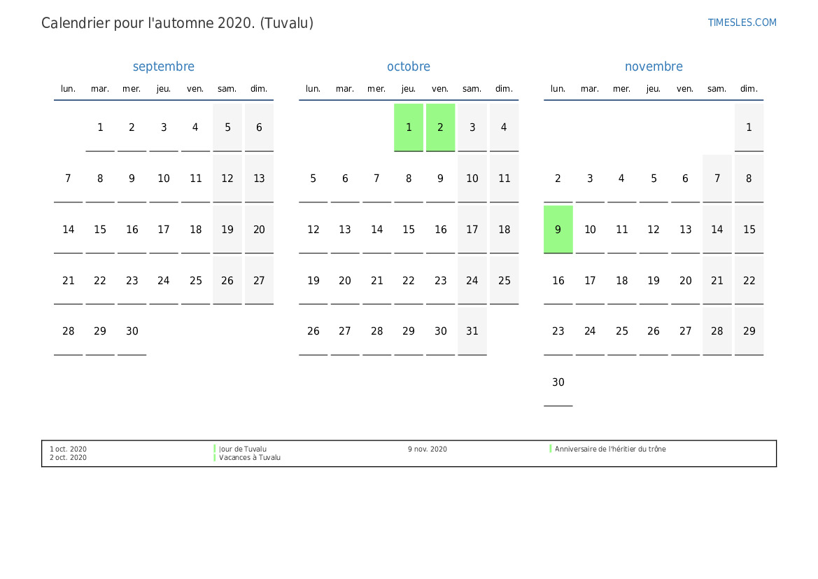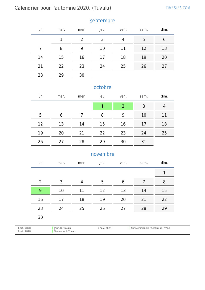 Téléchargez et imprimez le calendrier PDF avec les jours fériés et les week-ends pour l'automne 2020 pour Tuvalu