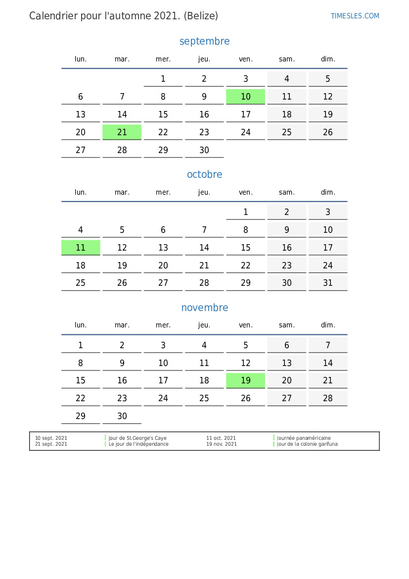 Téléchargez et imprimez le calendrier PDF avec les jours fériés et les week-ends pour l'automne 2021 pour le Belize