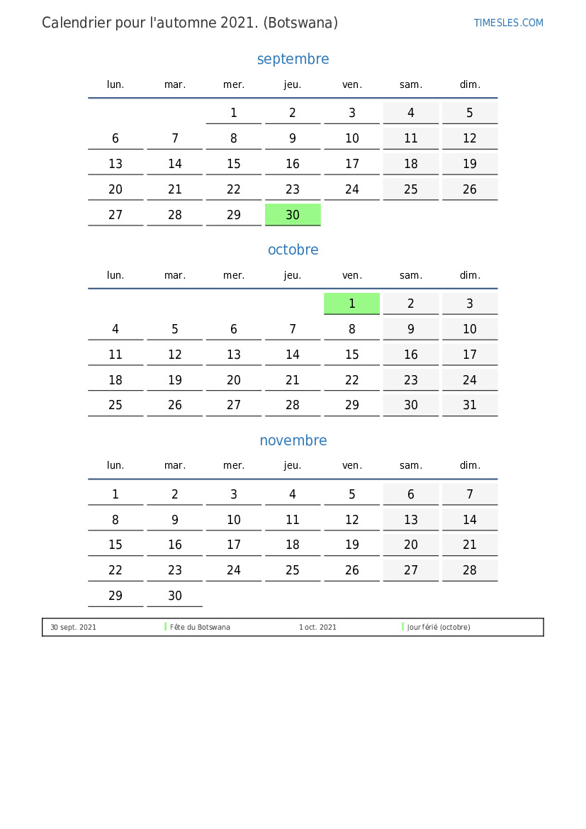 Téléchargez et imprimez le calendrier PDF avec les jours fériés et les week-ends pour l'automne 2021 pour le Botswana