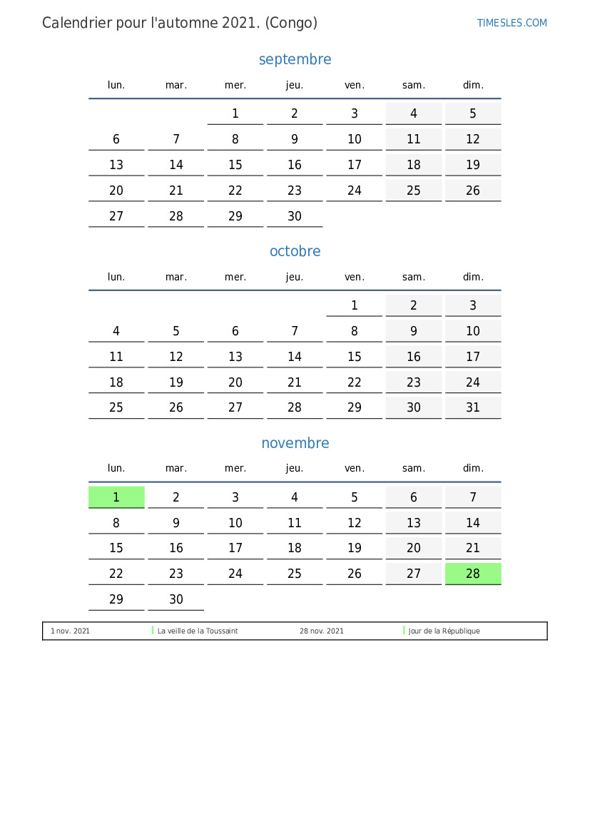 Téléchargez et imprimez le calendrier PDF avec les jours fériés et les week-ends pour l'automne 2021 pour le Congo