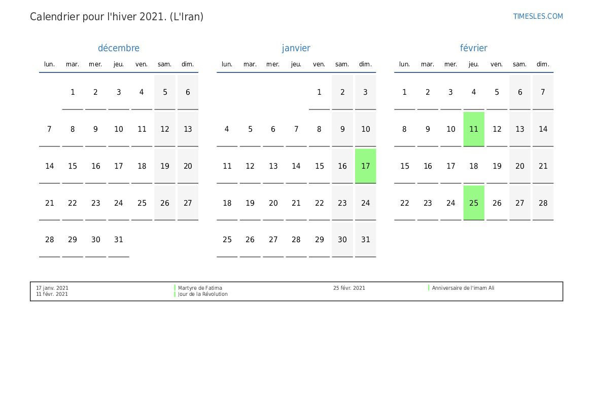 Calendrier des jours fériés et des week-ends pour l'automne 2021 pour l'Iran