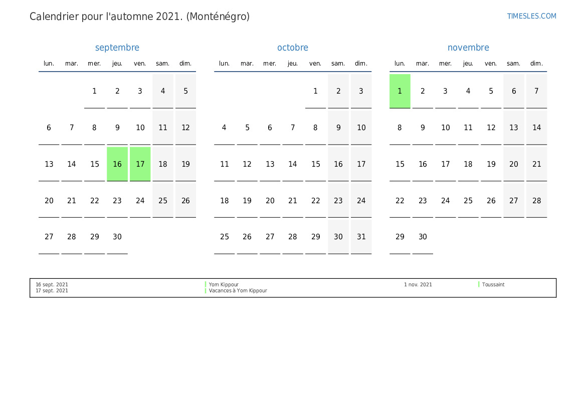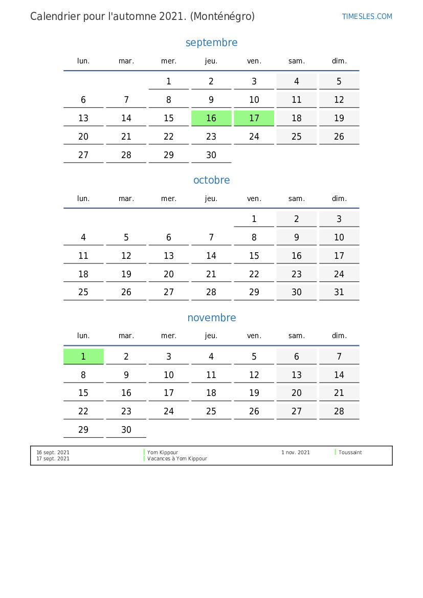 Téléchargez et imprimez le calendrier PDF avec les jours fériés et les week-ends pour l'automne 2021 pour le Monténégro