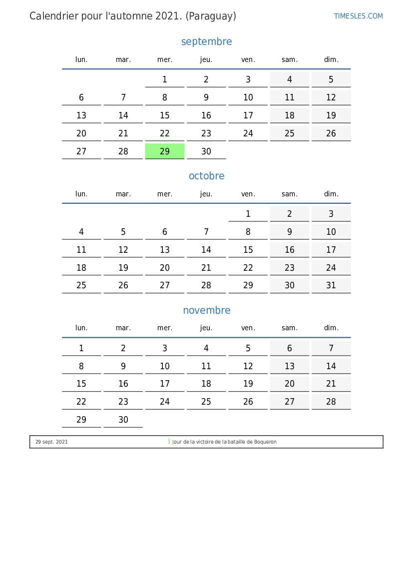 Téléchargez et imprimez le calendrier PDF avec les jours fériés et les week-ends pour l'automne 2021 pour le Paraguay