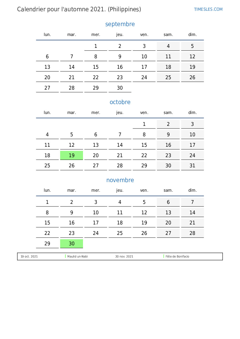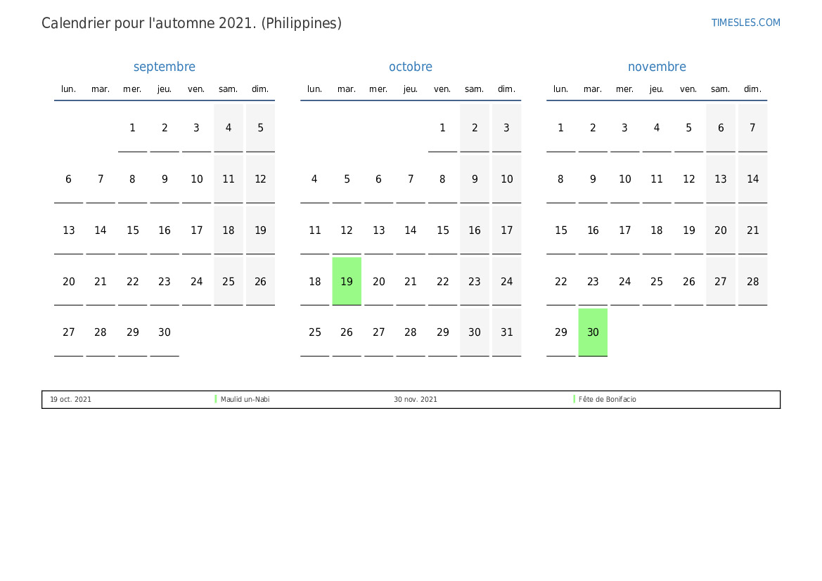 Téléchargez et imprimez le calendrier PDF avec les jours fériés et les week-ends pour l'automne 2021 pour les Philippines