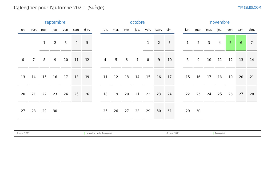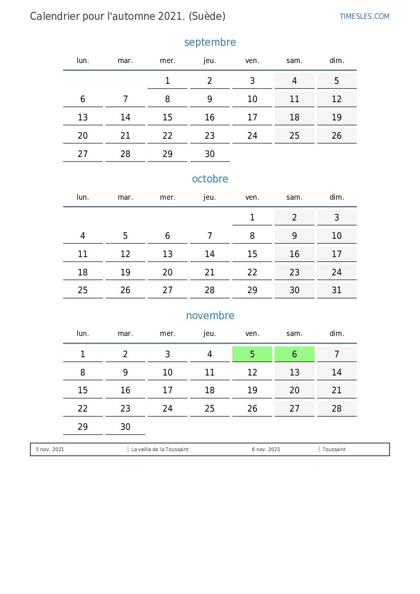 Téléchargez et imprimez le calendrier PDF avec les jours fériés et les week-ends pour l'automne 2021 pour la Suède