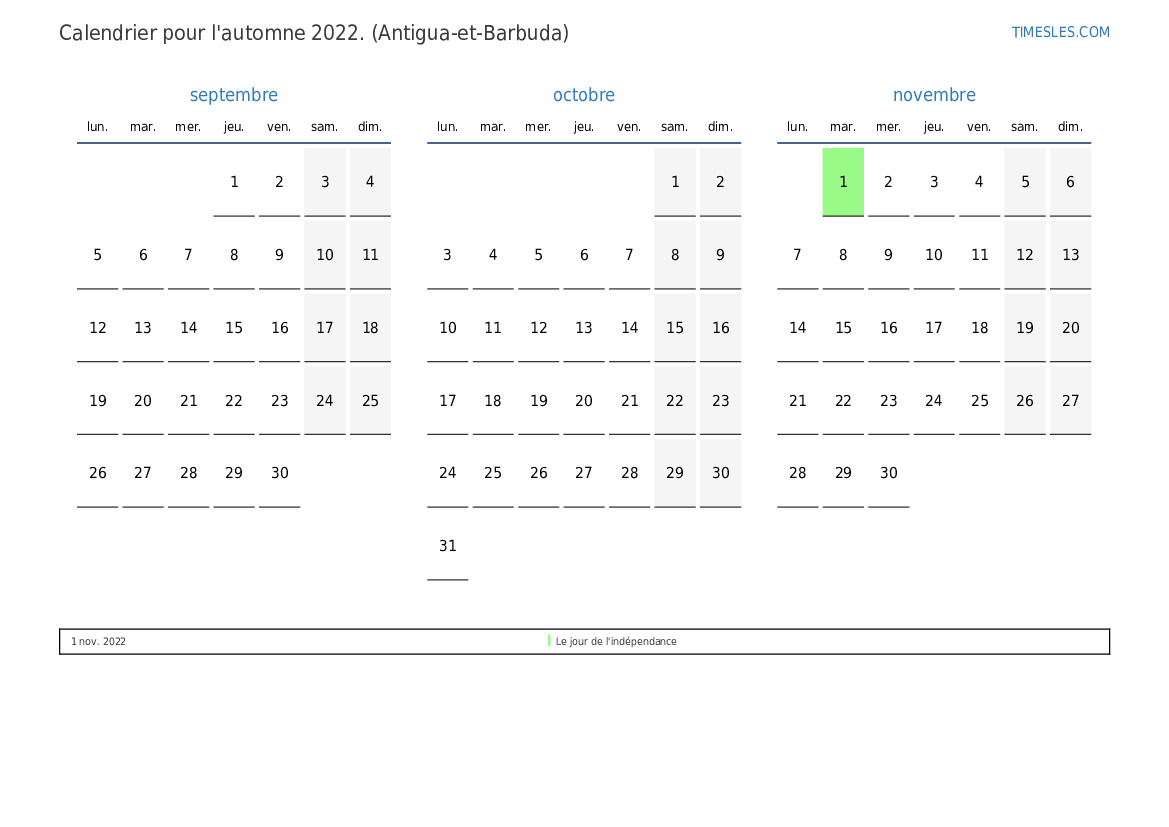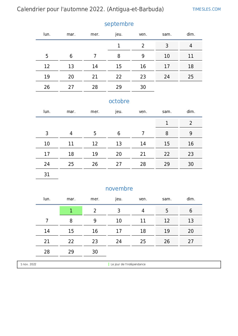 Téléchargez et imprimez le calendrier PDF avec les jours fériés et les week-ends pour l'automne 2022 pour Antigua et Barbuda