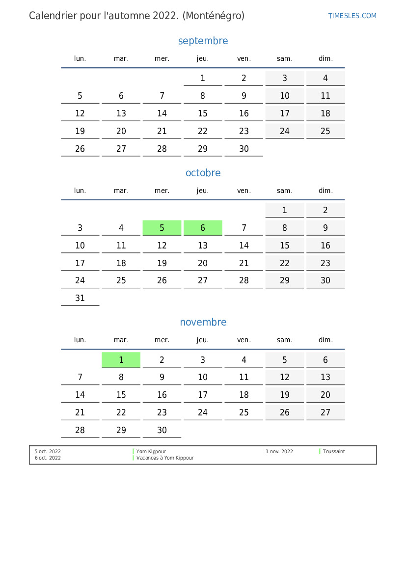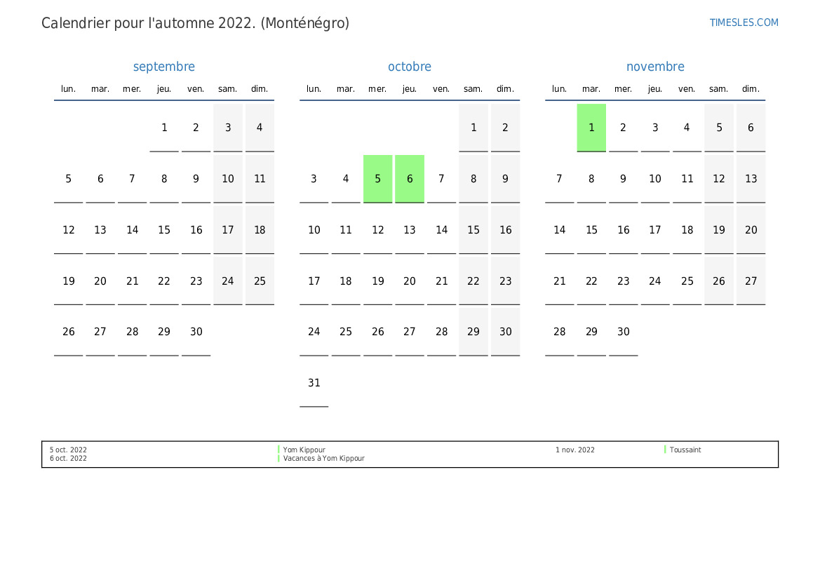 Téléchargez et imprimez le calendrier PDF avec les jours fériés et les week-ends pour l'automne 2022 pour le Monténégro