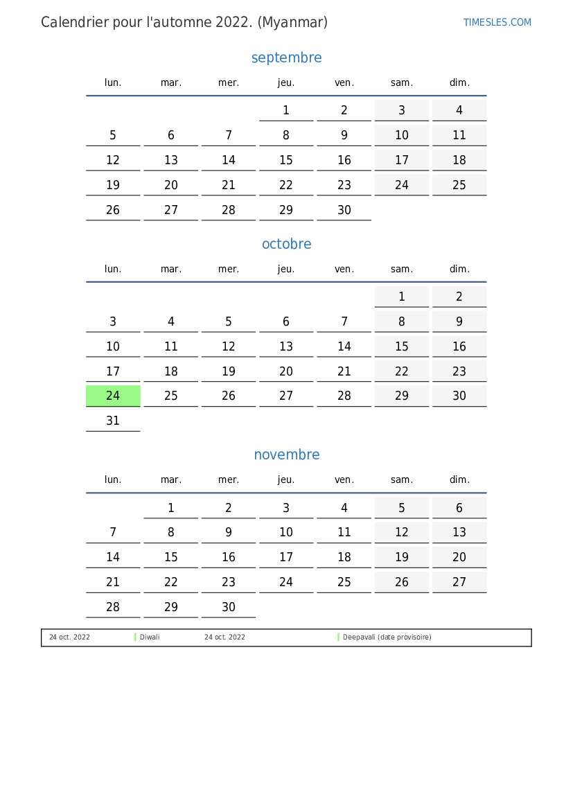 Téléchargez et imprimez le calendrier PDF avec les jours fériés et les week-ends pour l'automne 2022 pour le Myanmar