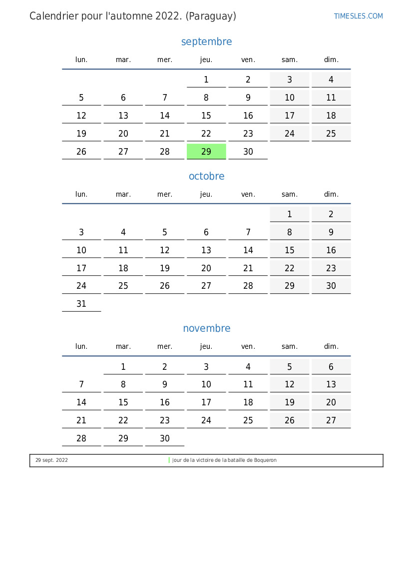 Téléchargez et imprimez le calendrier PDF avec les jours fériés et les week-ends pour l'automne 2022 pour le Paraguay