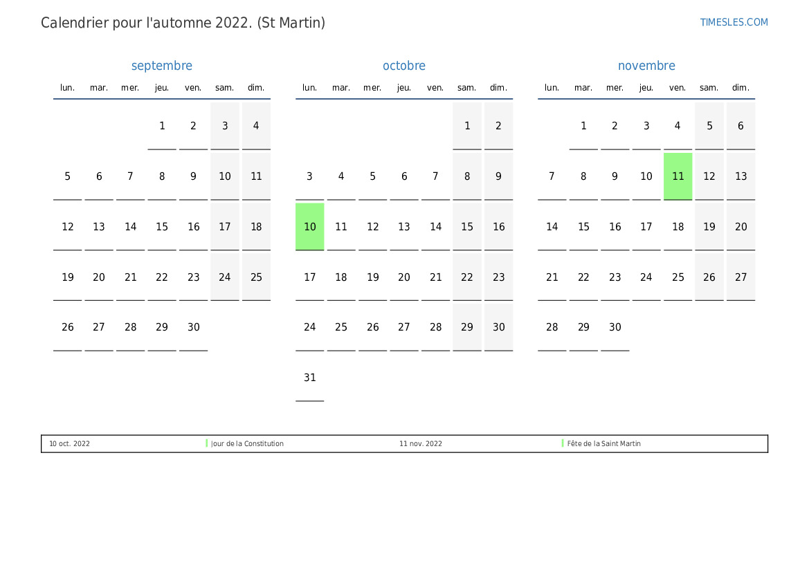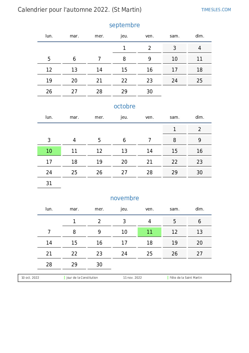 Téléchargez et imprimez le calendrier PDF avec les jours fériés et les week-ends pour l'automne 2022 pour Sint Maarten