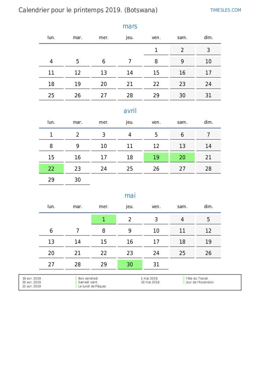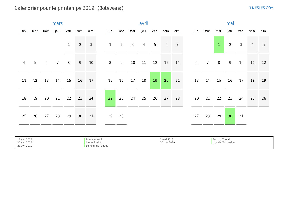 Téléchargez et imprimez le calendrier PDF avec les jours fériés et les week-ends pour le printemps 2019 pour le Botswana