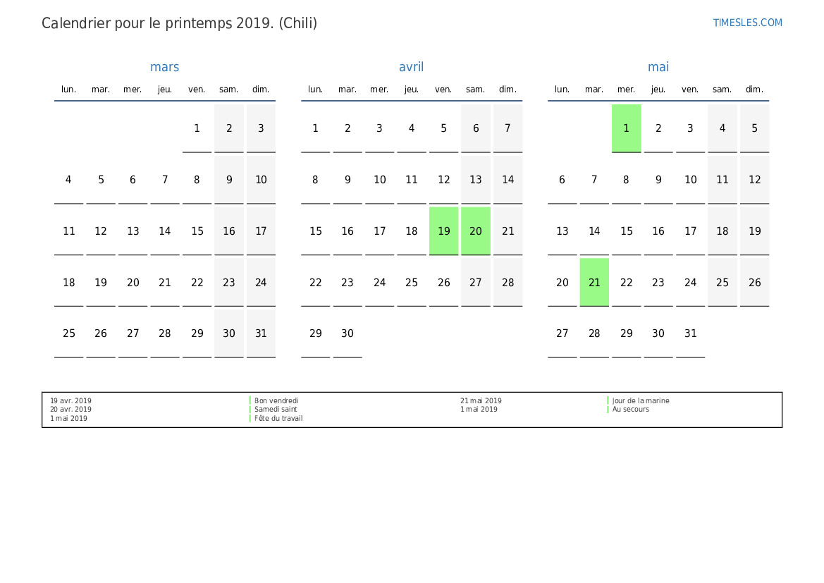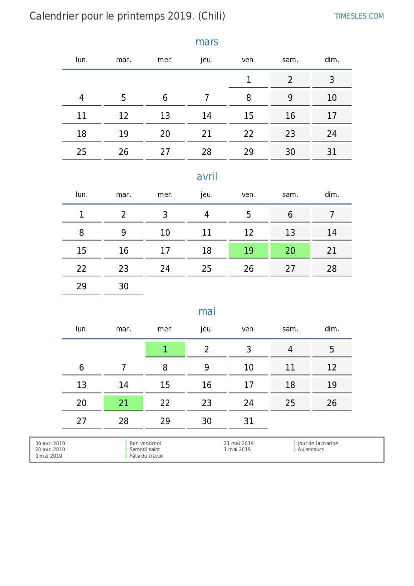 Téléchargez et imprimez le calendrier PDF avec les jours fériés et les week-ends pour le printemps 2019 pour le Chili