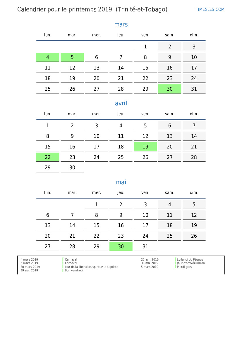 Téléchargez et imprimez le calendrier PDF avec les jours fériés et les week-ends pour le printemps 2019 pour Trinité-et-Tobago
