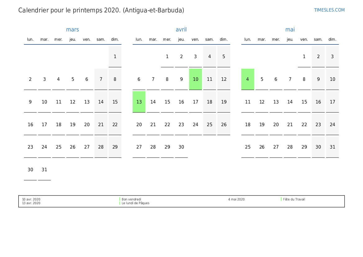 Téléchargez et imprimez le calendrier PDF avec les jours fériés et les week-ends pour le printemps 2020 pour Antigua et Barbuda