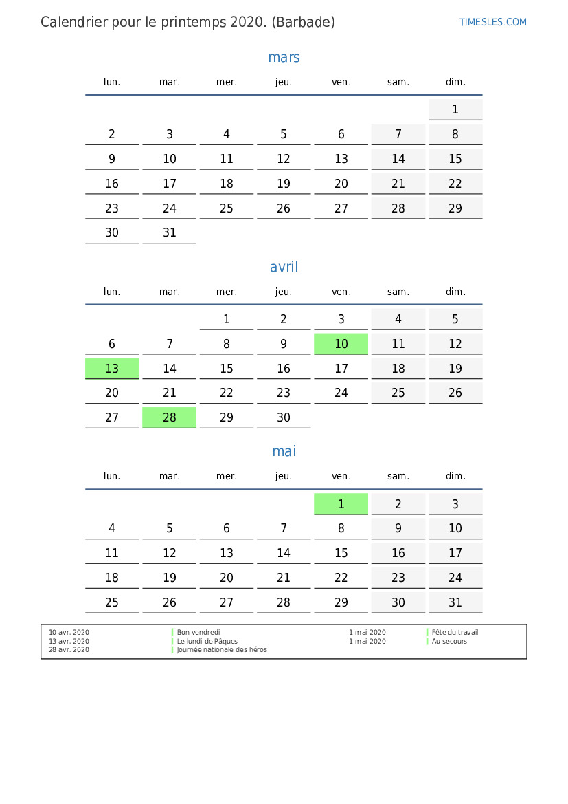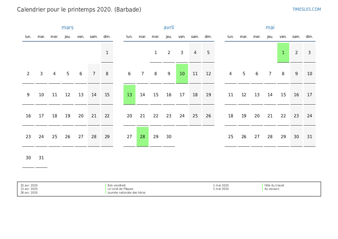 Téléchargez et imprimez le calendrier PDF avec les jours fériés et les week-ends pour le printemps 2020 pour la Barbade