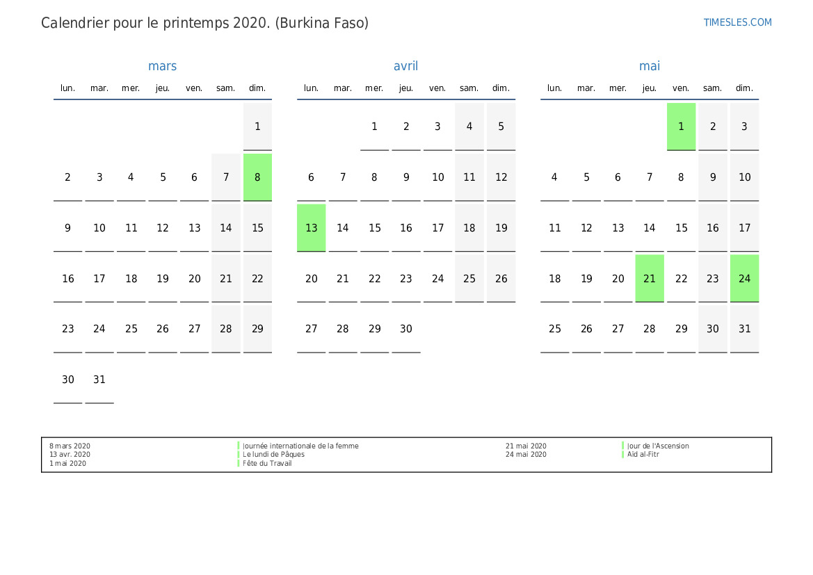 Téléchargez et imprimez le calendrier PDF avec les jours fériés et les week-ends pour le printemps 2020 pour le Burkina Faso