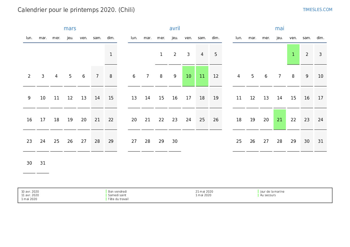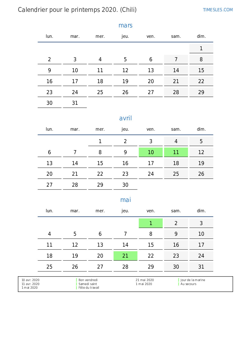 Téléchargez et imprimez le calendrier PDF avec les jours fériés et les week-ends pour le printemps 2020 pour le Chili