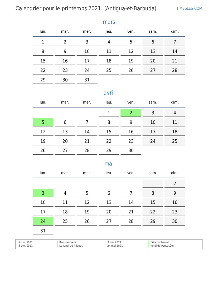 Téléchargez et imprimez le calendrier PDF avec les jours fériés et les week-ends pour le printemps 2021 pour Antigua et Barbuda