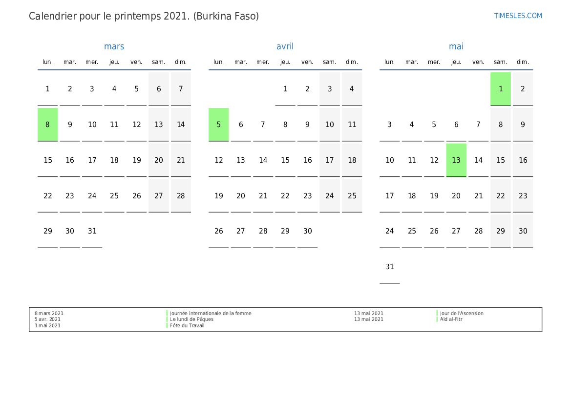 Téléchargez et imprimez le calendrier PDF avec les jours fériés et les week-ends pour le printemps 2021 pour le Burkina Faso