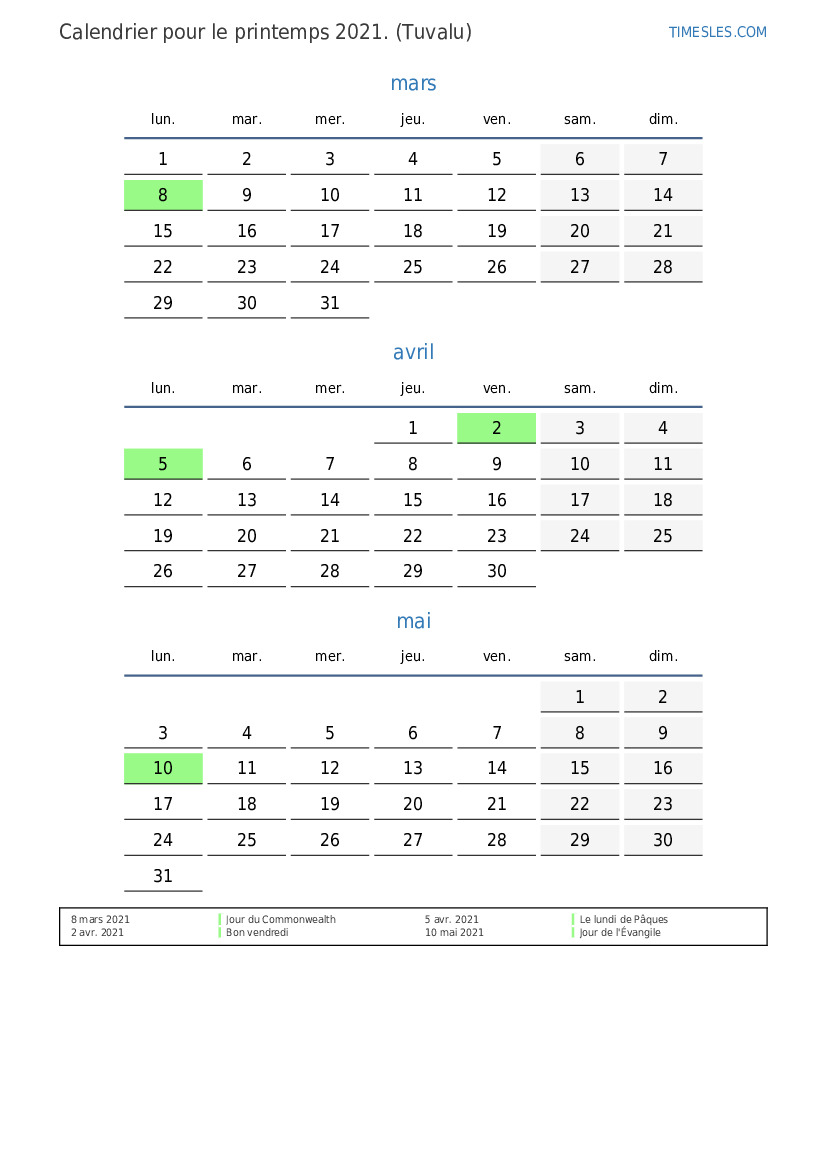 Téléchargez et imprimez le calendrier PDF avec les jours fériés et les week-ends pour le printemps 2021 pour Tuvalu