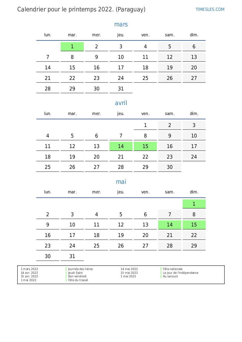 Téléchargez et imprimez le calendrier PDF avec les jours fériés et les week-ends pour le printemps 2022 pour le Paraguay