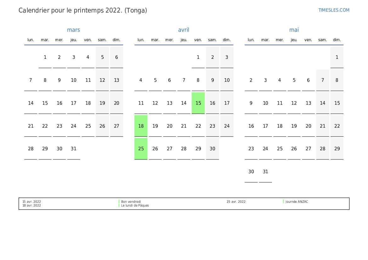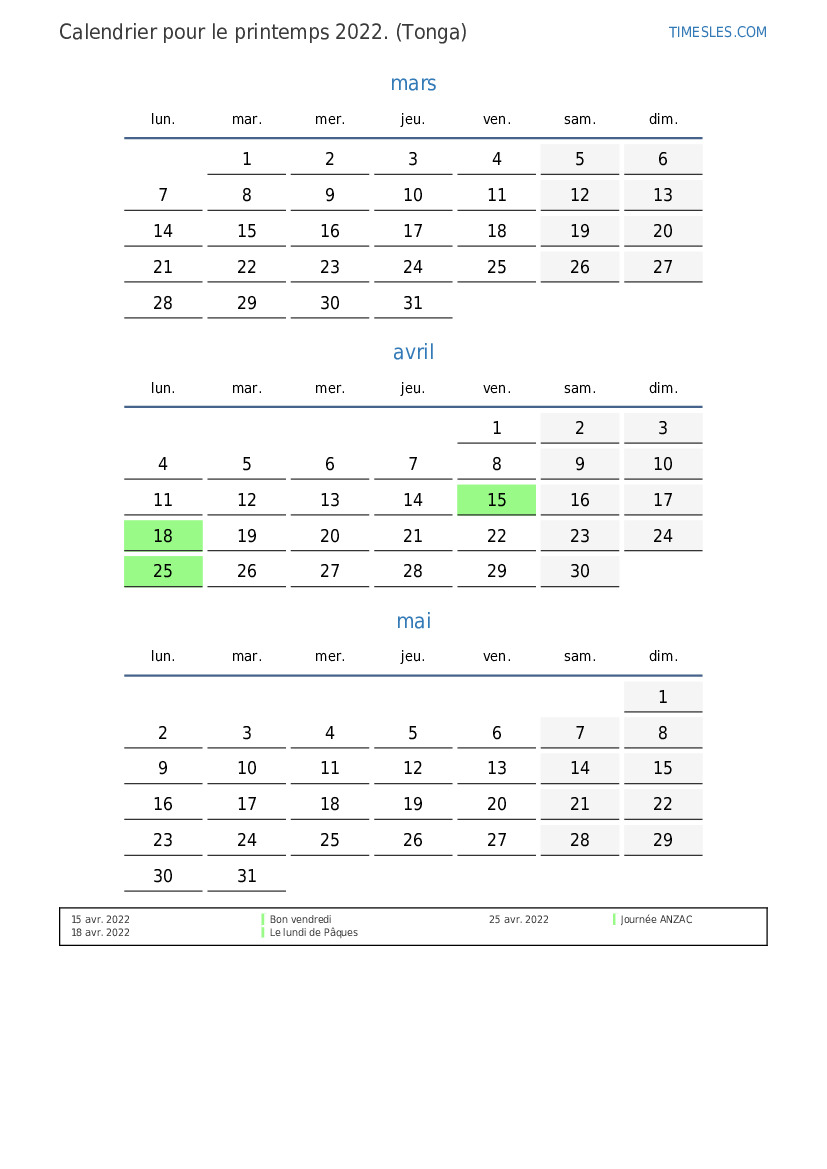 Téléchargez et imprimez le calendrier PDF avec les jours fériés et les week-ends pour le printemps 2022 pour les Tonga