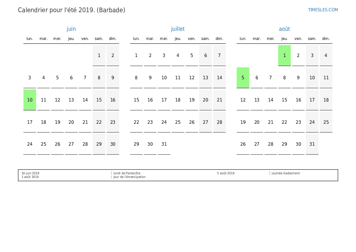 Téléchargez et imprimez le calendrier PDF avec les jours fériés et les week-ends pour l'été 2019 pour la Barbade