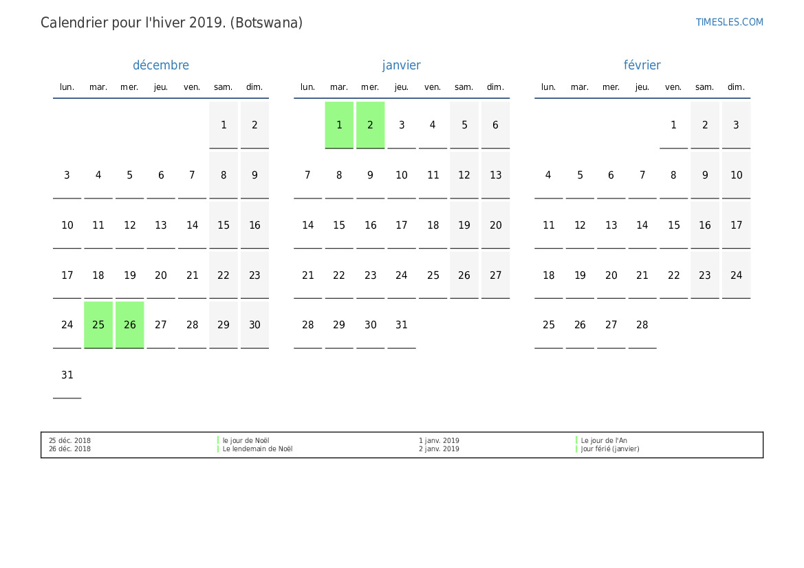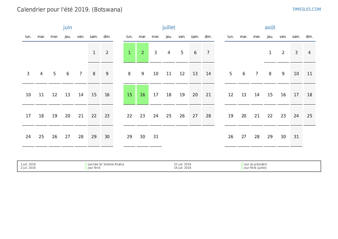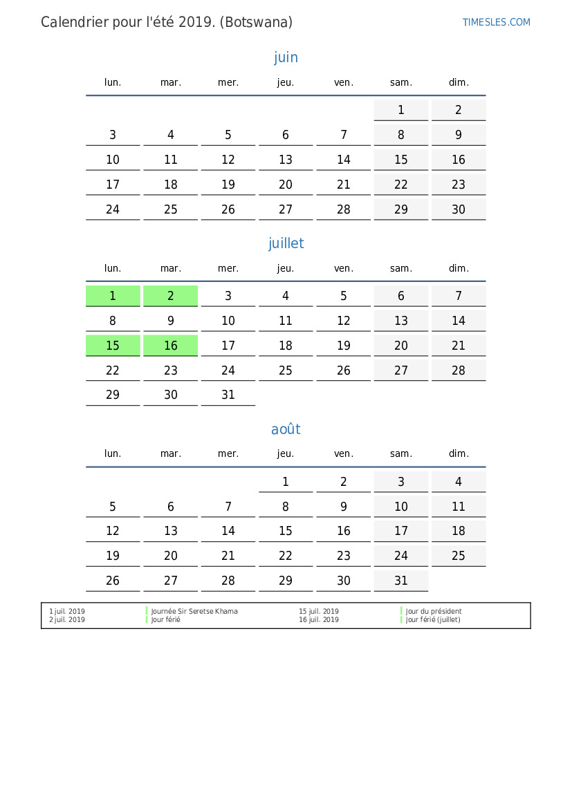 Téléchargez et imprimez le calendrier PDF avec les jours fériés et les week-ends pour l'été 2019 pour le Botswana