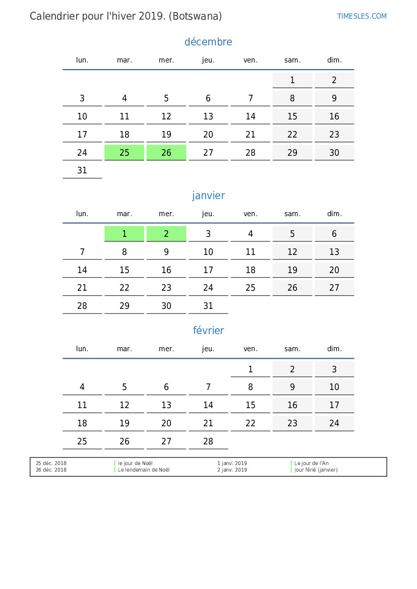 Calendrier des jours fériés et des week-ends pour l'été 2019 pour le Botswana