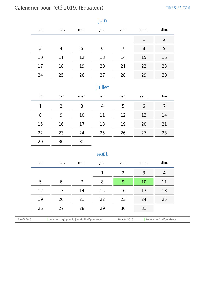 Calendrier des jours fériés et des week-ends pour l'été 2019 pour l'Équateur