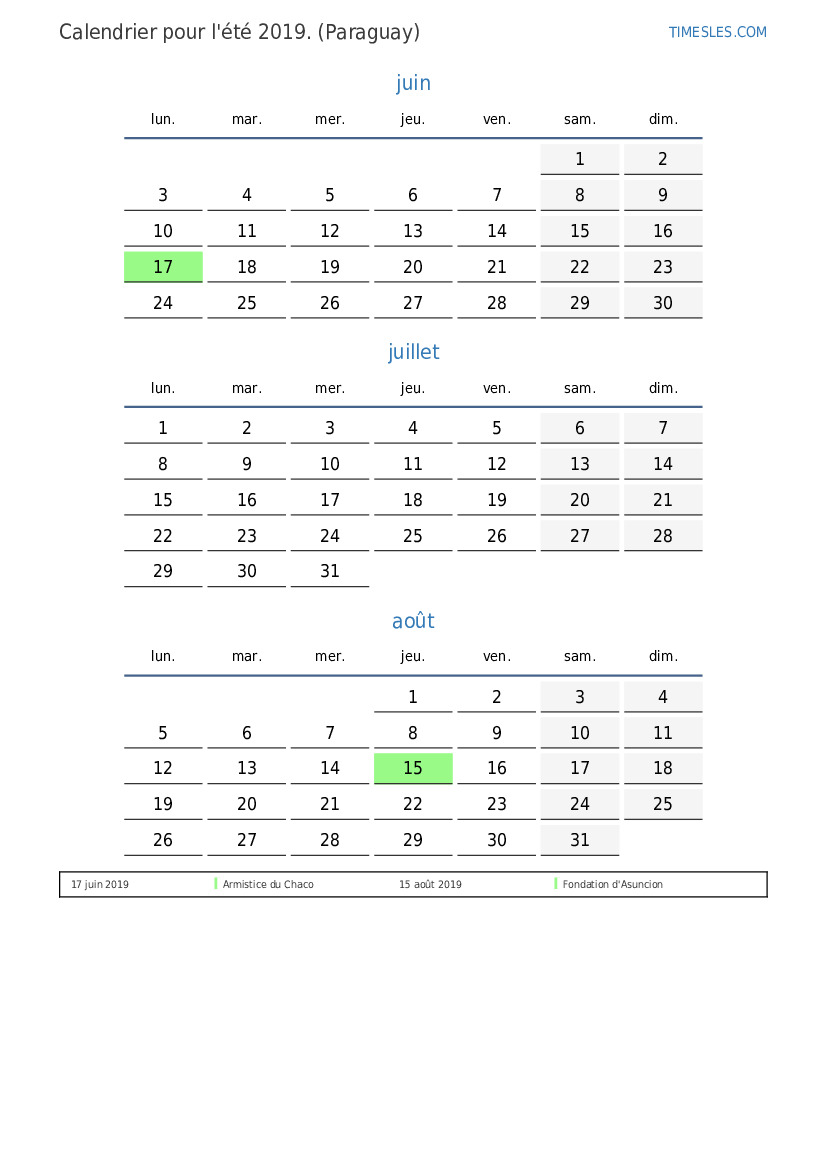 Téléchargez et imprimez le calendrier PDF avec les jours fériés et les week-ends pour l'été 2019 pour le Paraguay