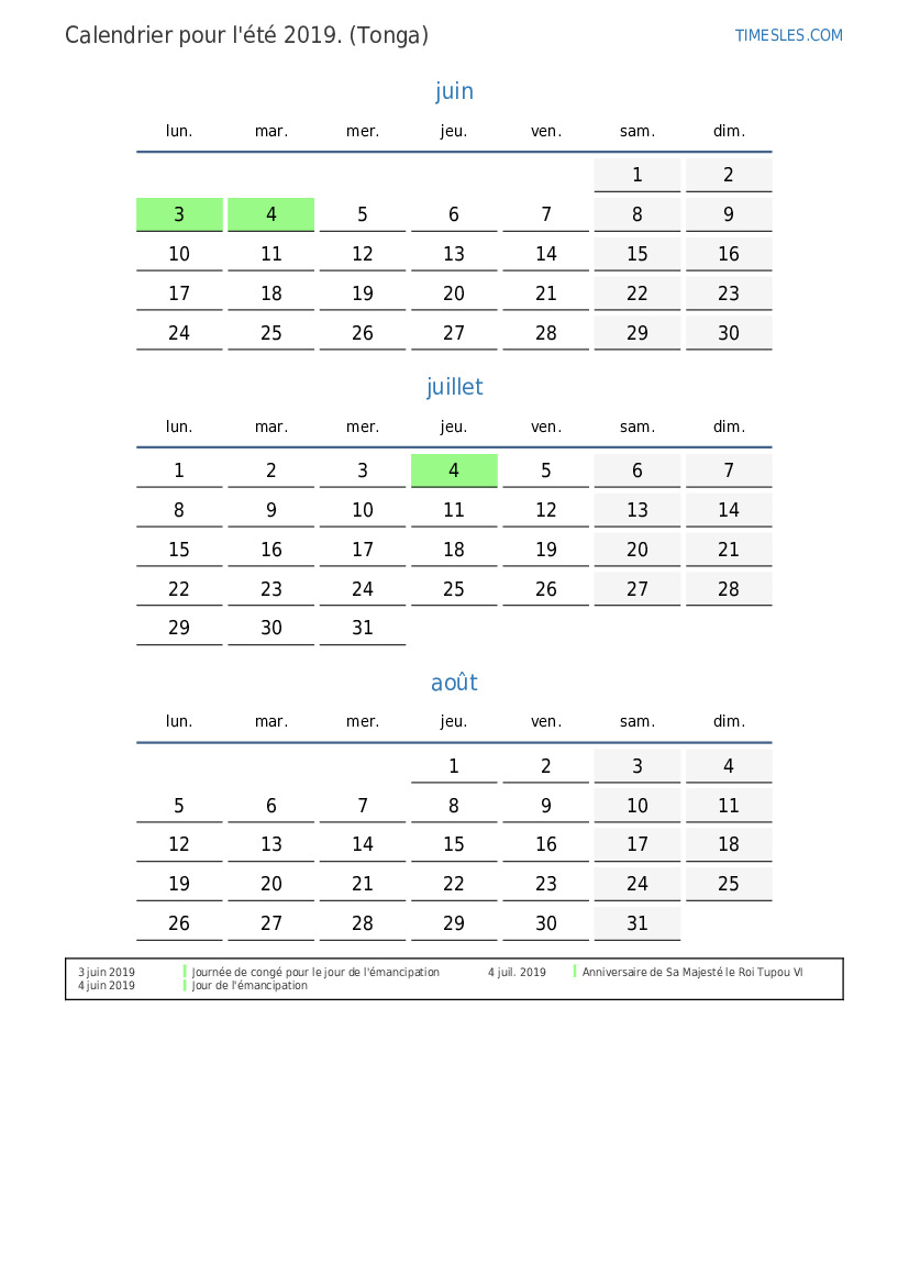 Téléchargez et imprimez le calendrier PDF avec les jours fériés et les week-ends pour l'été 2019 pour les Tonga