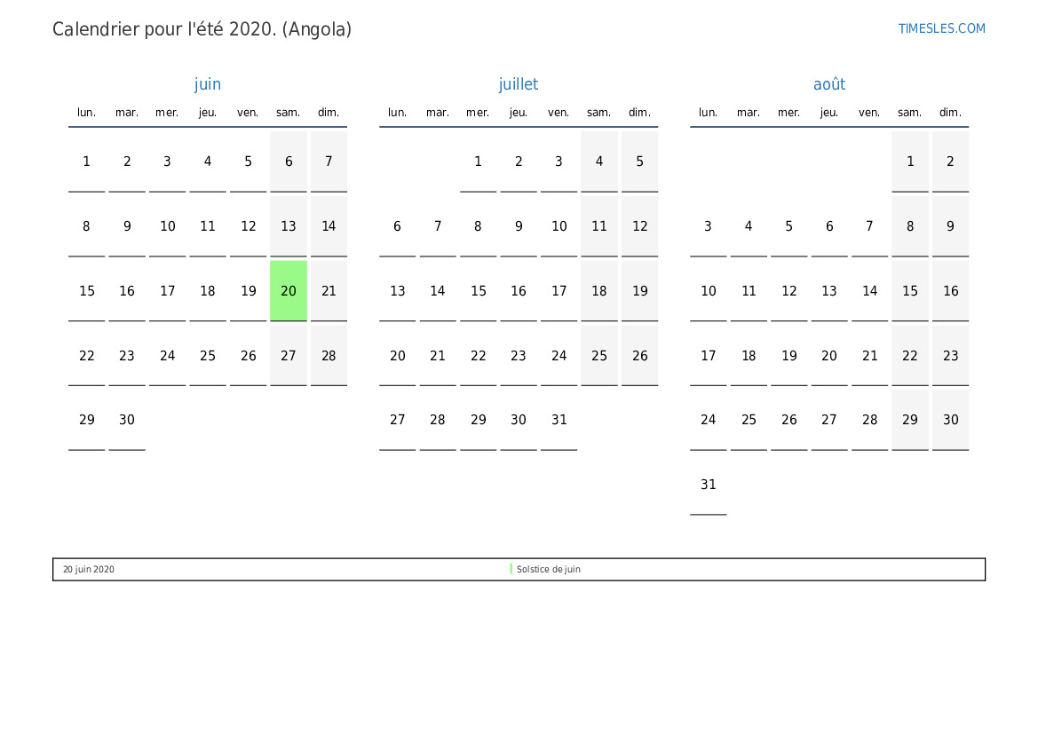 Téléchargez et imprimez le calendrier PDF avec les jours fériés et les week-ends pour l'été 2020 pour l'Angola