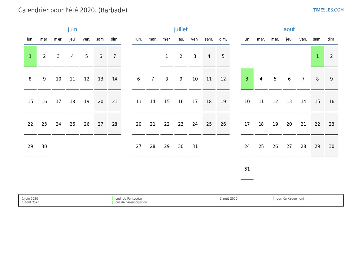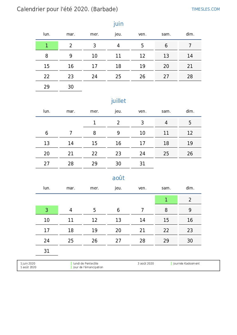 Téléchargez et imprimez le calendrier PDF avec les jours fériés et les week-ends pour l'été 2020 pour la Barbade