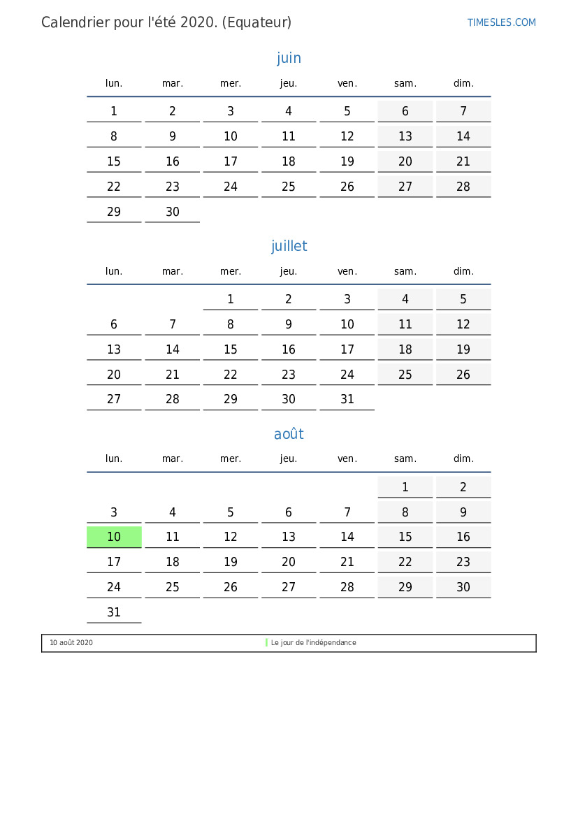 Téléchargez et imprimez le calendrier PDF avec les jours fériés et les week-ends pour l'été 2020 pour l'Équateur