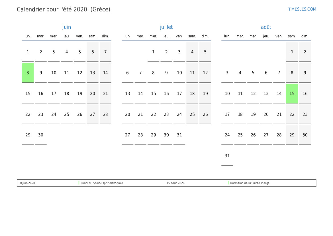 Calendrier des jours fériés et des week-ends pour l'été 2020 pour la Grèce