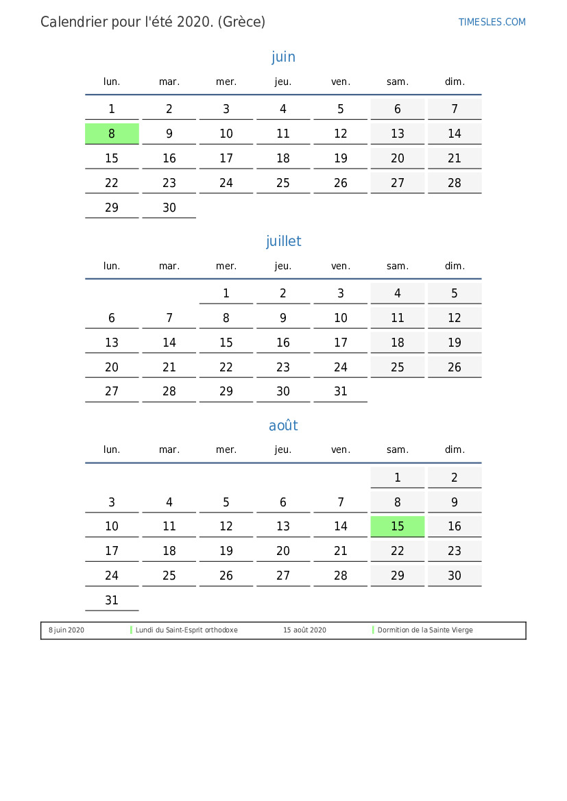 Téléchargez et imprimez le calendrier PDF avec les jours fériés et les week-ends pour l'été 2020 pour la Grèce