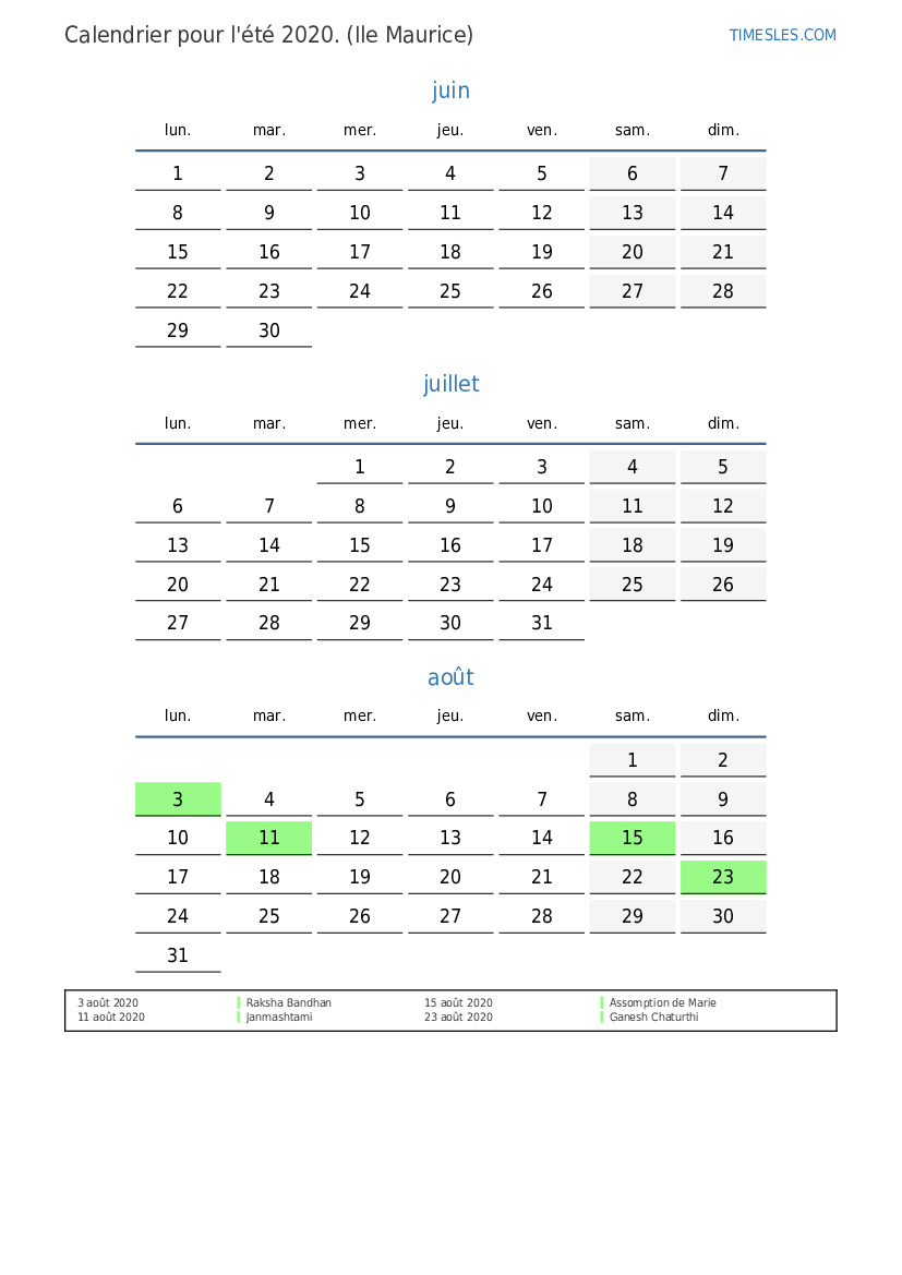 Téléchargez et imprimez le calendrier PDF avec les jours fériés et les week-ends pour l'été 2020 pour Maurice