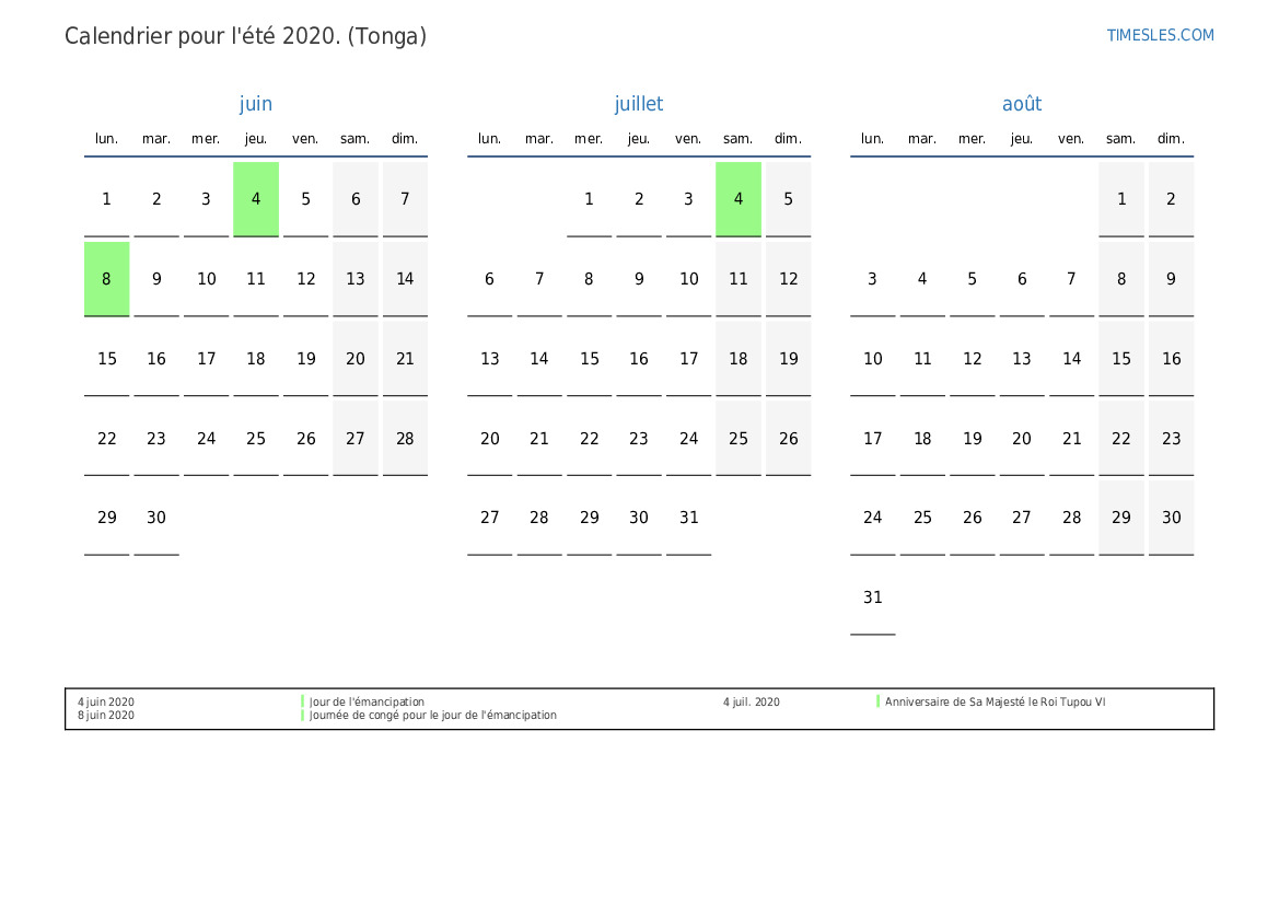 Téléchargez et imprimez le calendrier PDF avec les jours fériés et les week-ends pour l'été 2020 pour les Tonga