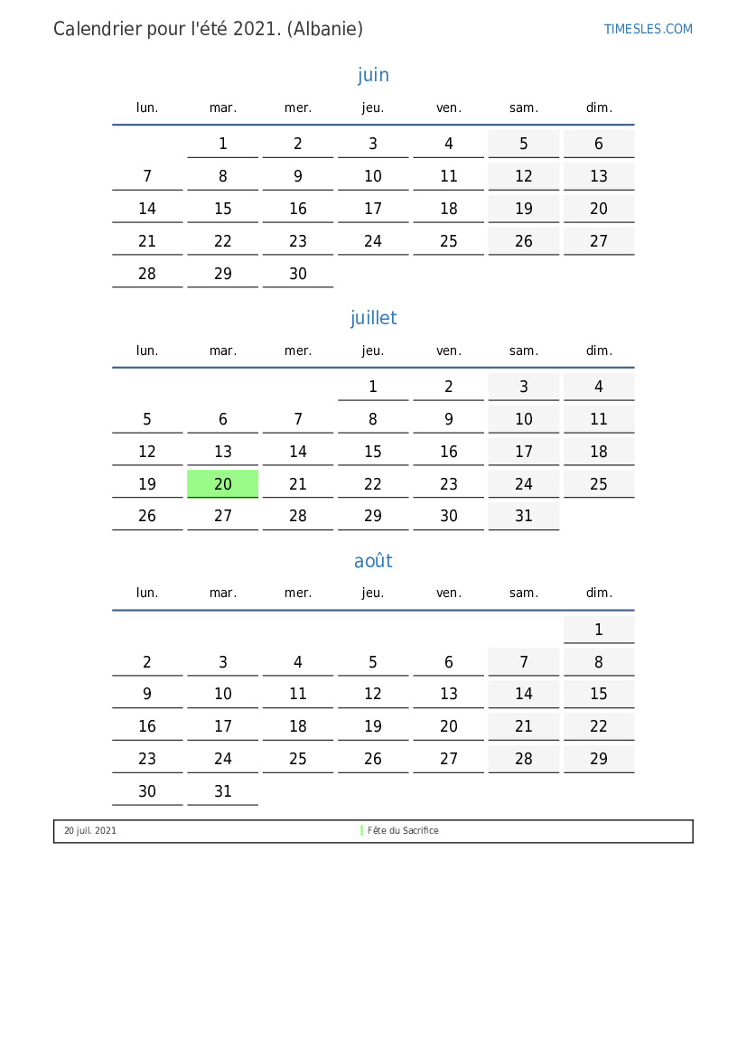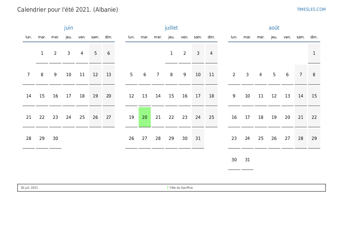 Téléchargez et imprimez le calendrier PDF avec les jours fériés et les week-ends pour l'été 2021 pour l'Albanie