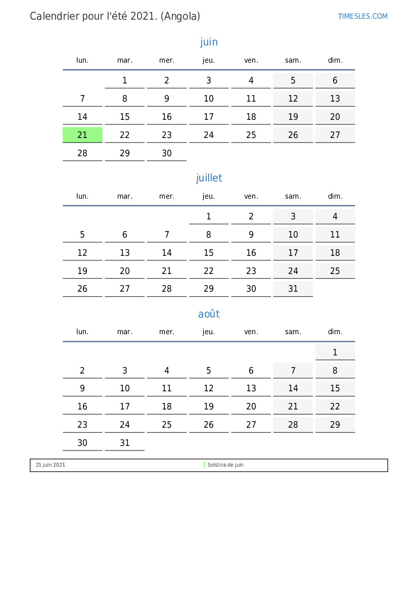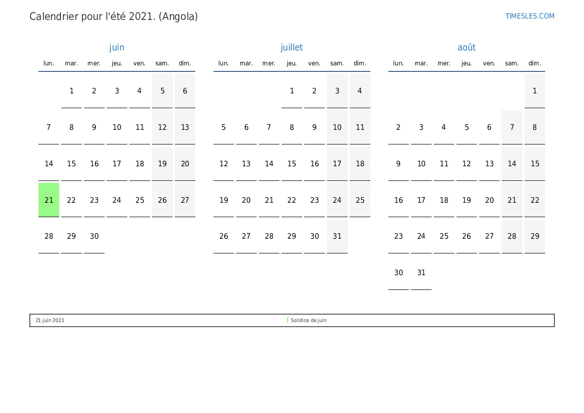 Téléchargez et imprimez le calendrier PDF avec les jours fériés et les week-ends pour l'été 2021 pour l'Angola