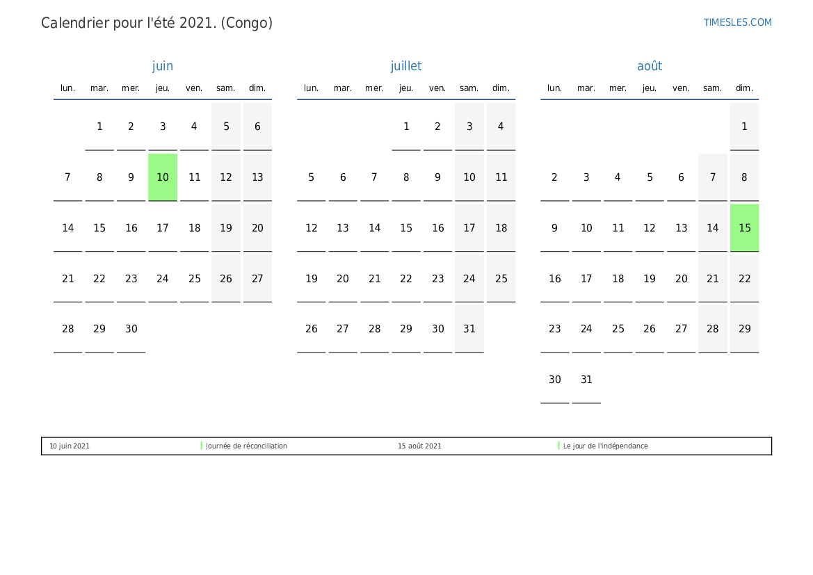 Calendrier des jours fériés et des week-ends pour l'été 2021 pour le Congo