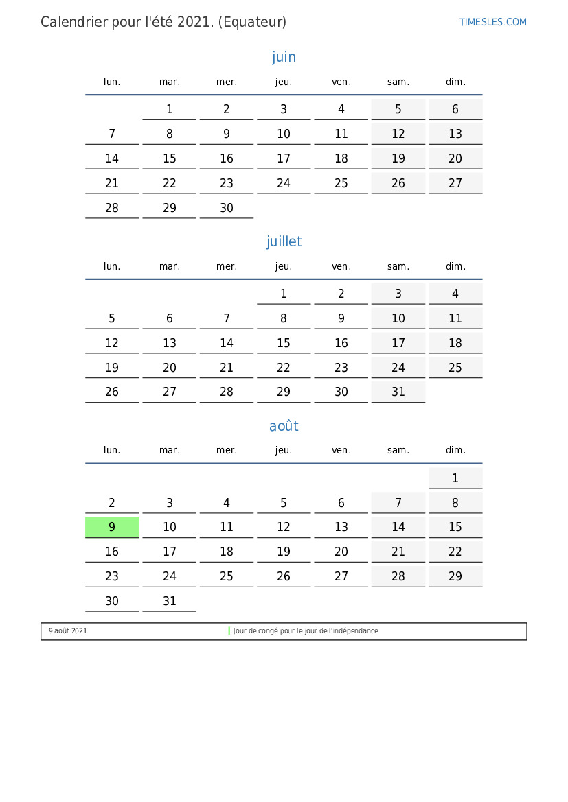 Téléchargez et imprimez le calendrier PDF avec les jours fériés et les week-ends pour l'été 2021 pour l'Équateur