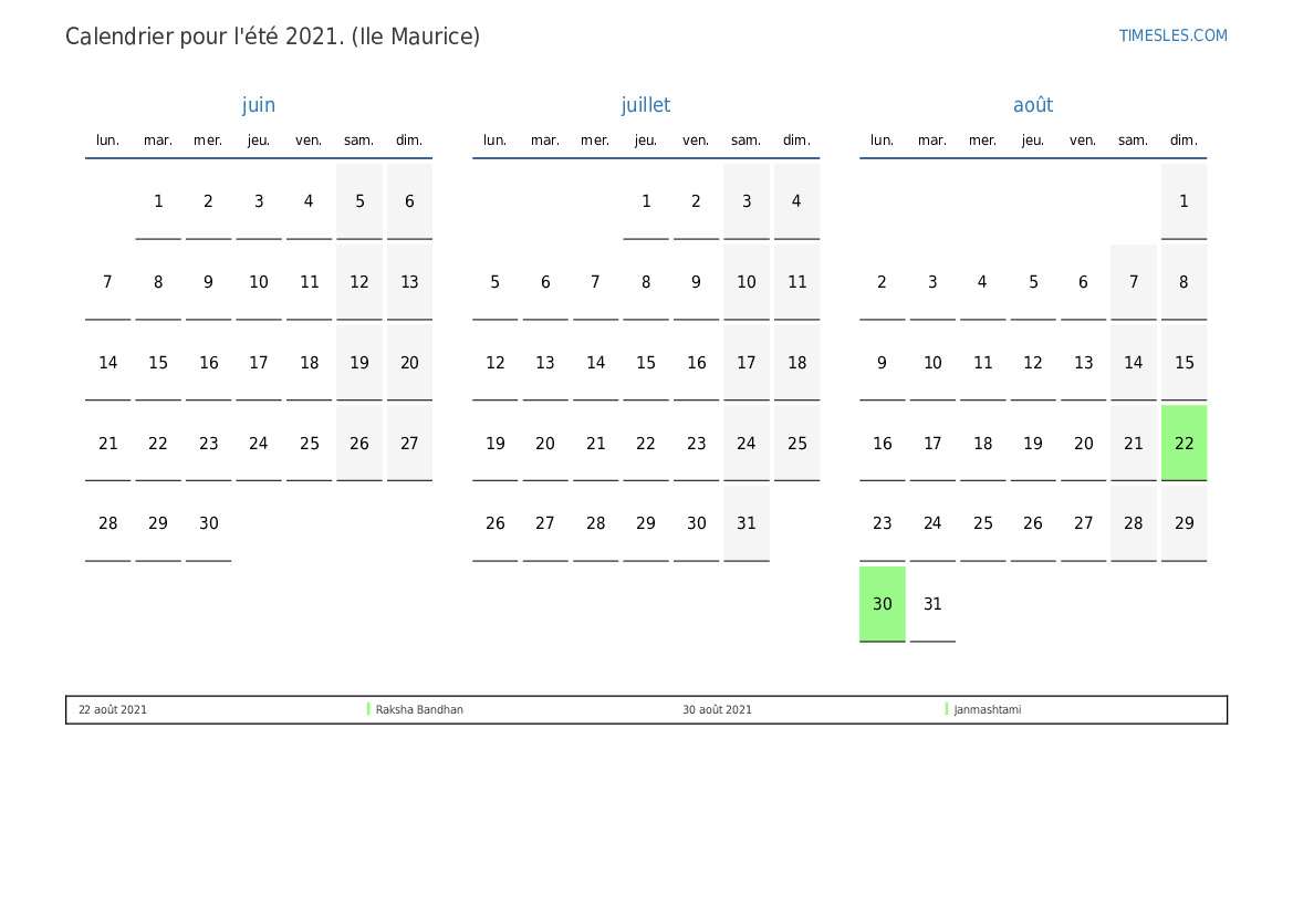 Téléchargez et imprimez le calendrier PDF avec les jours fériés et les week-ends pour l'été 2021 pour Maurice