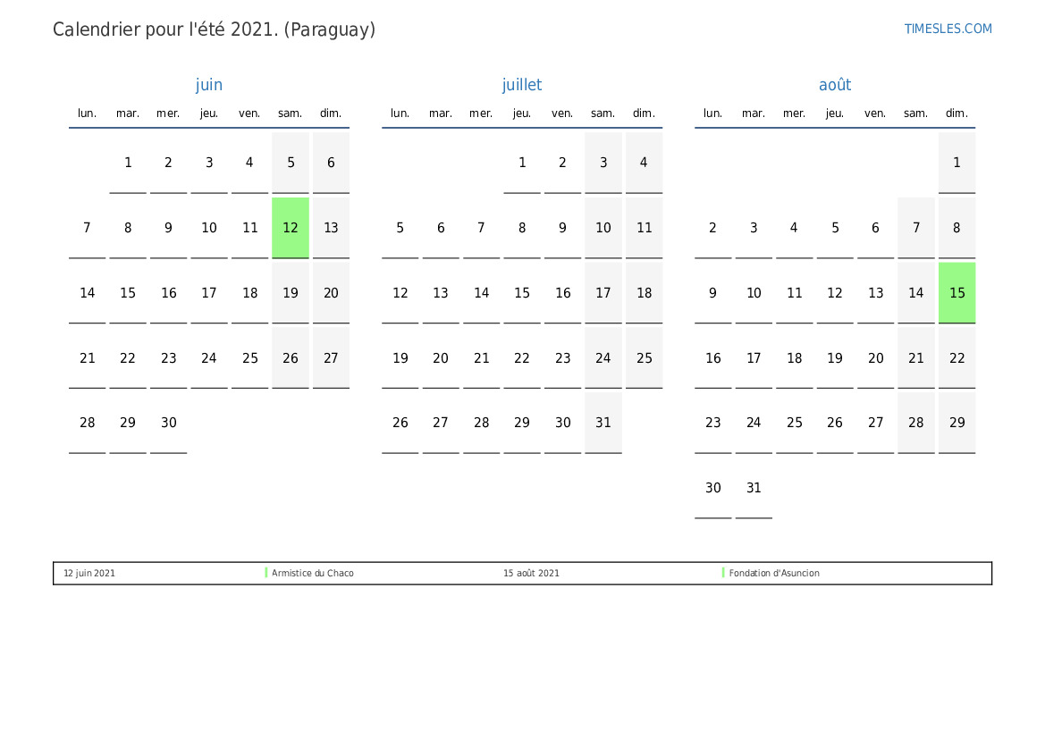 Calendrier des jours fériés et des week-ends pour l'été 2021 pour le Paraguay