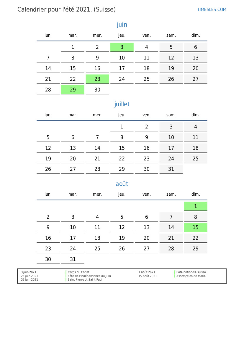 Téléchargez et imprimez le calendrier PDF avec les jours fériés et les week-ends pour l'été 2021 pour la Suisse