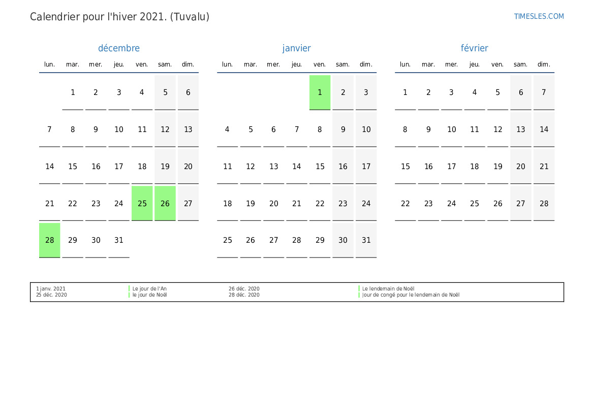 Calendrier pour l'été 2021 à Tuvalu